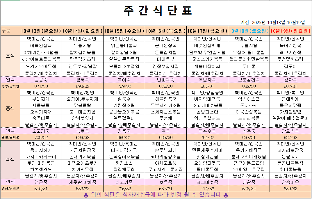 10월 3째주 주간메뉴표입니다 페이지 정보 작성자 관리자 댓글 0건 조회 207회 작성일 25-10-11 12:56 본문 목록 이전글10월 4째주 주간메뉴표입니다 25.10.18 다음글10월2째주 주간메뉴표입니다 25.10.02