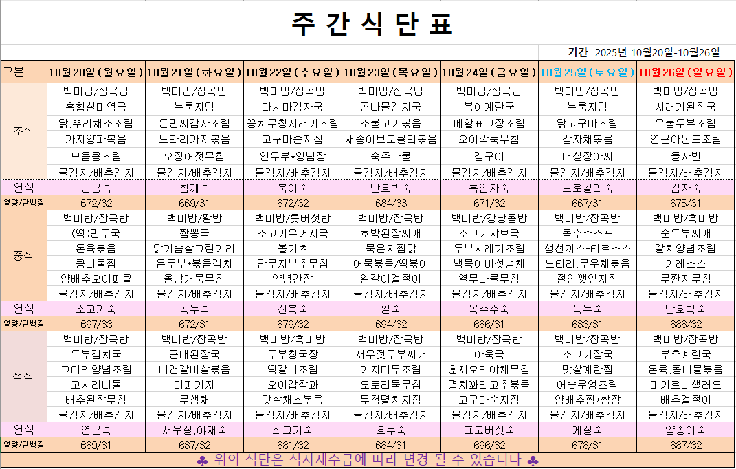 10월 4째주 주간메뉴표입니다 페이지 정보 작성자 관리자 댓글 0건 조회 205회 작성일 25-10-18 09:13 본문 목록 이전글10월 5째주 주간메뉴표입니다 25.10.24 다음글10월 3째주 주간메뉴표입니다 25.10.11