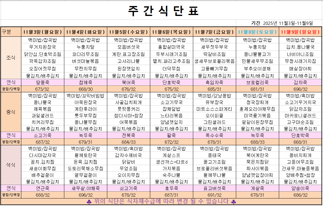 11월 1째주 주간메뉴표입니다 페이지 정보 작성자 관리자 댓글 0건 조회 225회 작성일 25-10-31 10:29 본문 목록 이전글11월 2째주 주간메뉴표입니다 25.11.07 다음글10월 5째주 주간메뉴표입니다 25.10.24