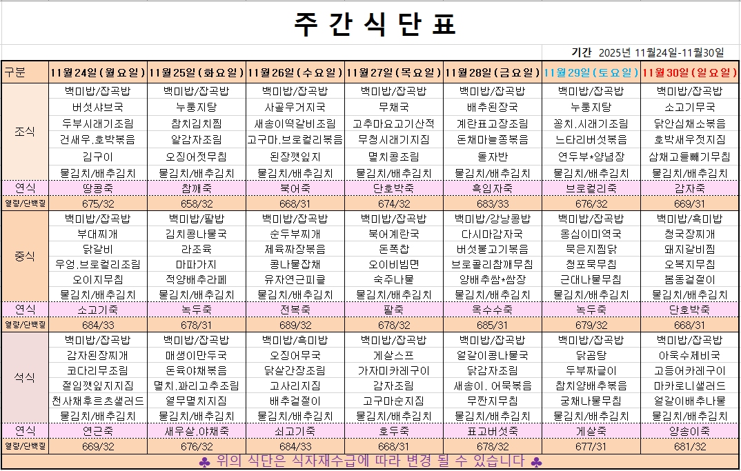 11월 4째주 주간메뉴표입니다 페이지 정보 작성자 관리자 댓글 0건 조회 217회 작성일 25-11-24 10:13 본문 목록 이전글12월 1째주 주간메뉴표입니다 25.11.29 다음글11월 3째주 주간메뉴표입니다 25.11.13