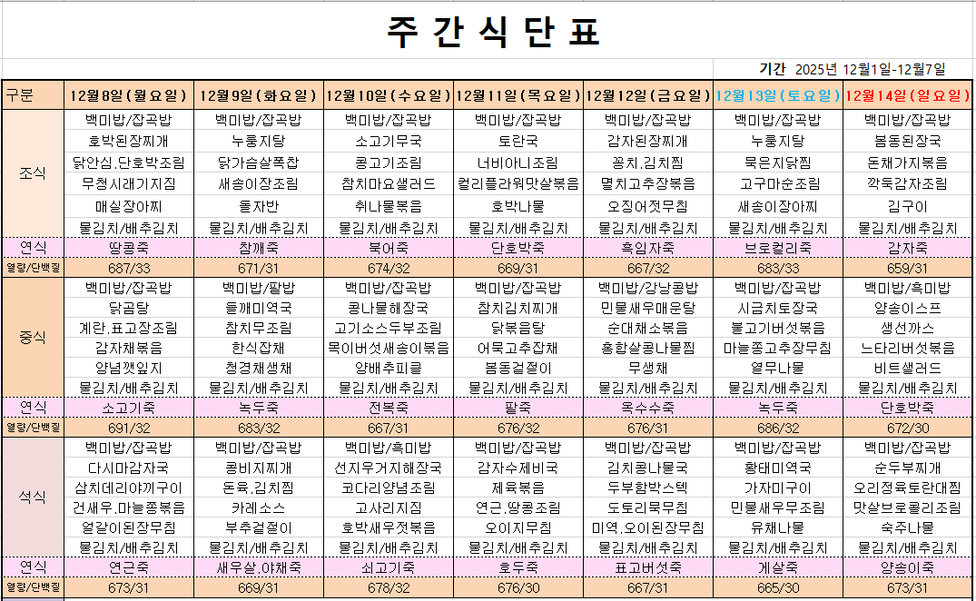 12월 2째주 주간메뉴표입니다 페이지 정보 작성자 관리자 댓글 0건 조회 243회 작성일 25-12-05 11:53 본문 목록 이전글12월 3째주 주간메뉴표입니다 25.12.13 다음글12월 1째주 주간메뉴표입니다 25.11.29
