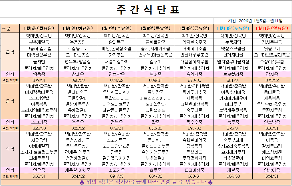 1월 1째주 주간메뉴표입니다 페이지 정보 작성자 관리자 댓글 0건 조회 231회 작성일 26-01-02 10:27 본문 목록 이전글1월 2째주 주간메뉴표입니다 26.01.10 다음글12월 5째주 주간메뉴표입니다 25.12.27