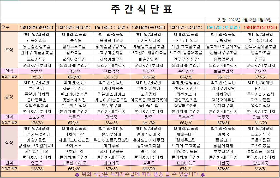 1월 2째주 주간메뉴표입니다 페이지 정보 작성자 관리자 댓글 0건 조회 222회 작성일 26-01-10 10:02 본문 목록 이전글1월 3째주 주간메뉴표입니다 26.01.16 다음글1월 1째주 주간메뉴표입니다 26.01.02