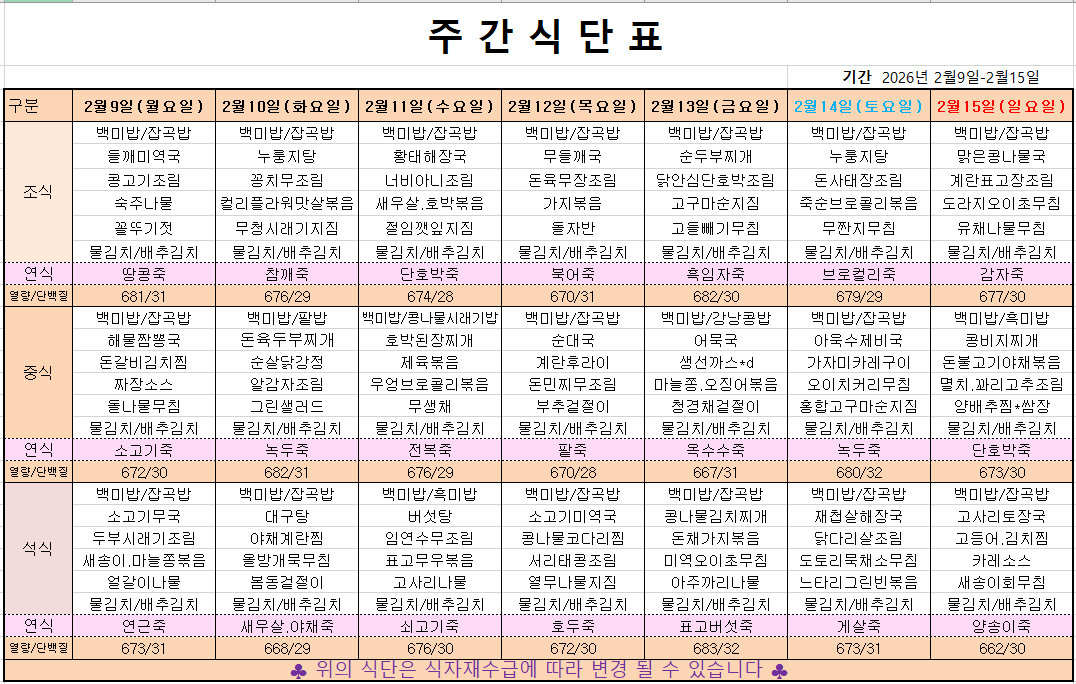 2월 2째주 주간메뉴표입니다 페이지 정보 작성자 관리자 댓글 0건 조회 157회 작성일 26-02-09 07:17 본문 목록 이전글2월 3째주 주간메뉴표입니다 26.02.13 다음글2월 1째주 주간메뉴표입니다 26.01.29