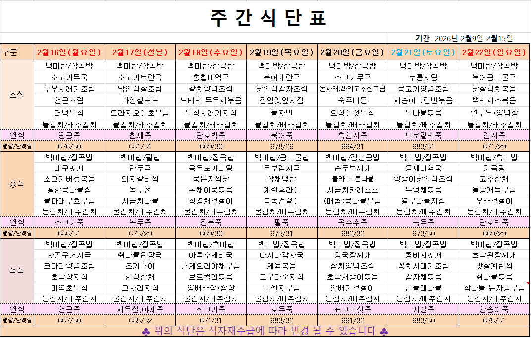 2월 3째주 주간메뉴표입니다