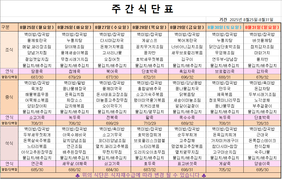 8월 4째주 주간메뉴표입니다 페이지 정보 작성자 관리자 댓글 0건 조회 183회 작성일 25-08-23 17:07 본문 목록 이전글9월 1째주 주간메뉴표입니다 25.08.30 다음글8월 3째주 주간메뉴표입니다 25.08.16
