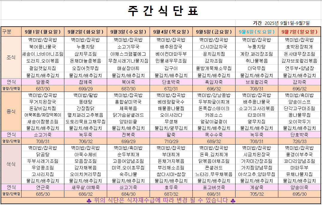 9월 1째주 주간메뉴표입니다 페이지 정보 작성자 관리자 댓글 0건 조회 177회 작성일 25-08-30 09:25 본문 목록 이전글9월 2째주 주간메뉴표입니다 25.09.06 다음글8월 4째주 주간메뉴표입니다 25.08.23